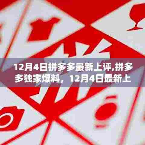 摘要:拼多多最新上架商品评价热潮于12月4日掀起,拼多多独家爆料,引发了广泛关注。此次评价热潮涉及最新上架的各类商品,消费者们纷纷发表自己的观点和体验,分享购物心得。这一事件展示了拼多多平台的活跃度和消费者的热情参与度。