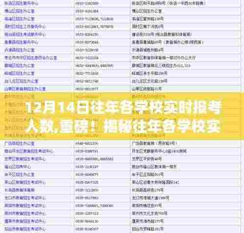摘要:在每年的报考大战中,各学校的实时报考人数备受关注。据最新消息,截至12月14日,各学校的报考人数已经出炉。本文揭示了这一数字背后的真相,让读者了解各学校的报考情况,为考生提供决策参考。