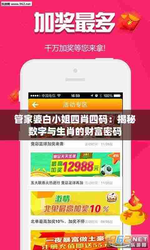 管家婆白小姐是澳门著名的财富管理专家,她通过深入研究数字与生肖的财富密码,为众多澳门居民提供财务指导,她认为,特定的生肖和数字组合能够影响个人的财富运势,通过特定的算法,可以预测出最具财富潜力的组合。