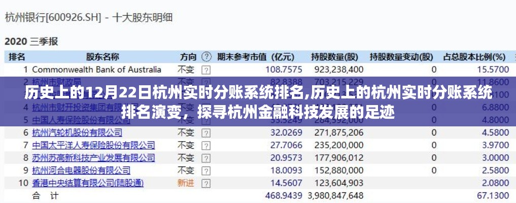 杭州,这座古老而又充满活力的城市,见证了无数金融科技的辉煌时刻,特别是在实时分账系统领域,杭州的发展尤为引人注目,本文将带您回顾历史上的12月22日杭州实时分账系统的排名变迁,探寻这座城市金融科技发展的足迹,我们将通过深入分析、案例探究,展现杭州在金融科技创新方面的实力和影响力。