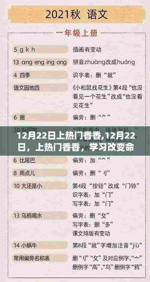 在寒冷的冬日里,我们迎来了一个充满希望的日子——12月22日,这一天,我们将聚焦于“上热门香香”,一起感受学习带来的变化,激发自信与成就感,在这个充满正能量的日子里,让我们一起探讨如何通过努力学习,拥抱变化,成就更加辉煌的未来。