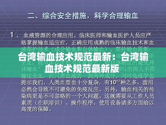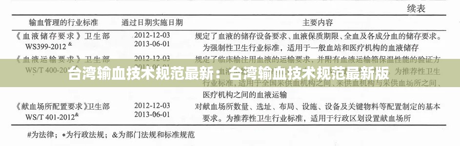 根据台湾卫生福利部门发布的最新输血技术规范,以下是一些主要内容: