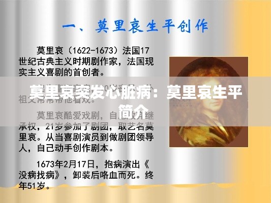 法国著名剧作家、喜剧大师莫里哀,以其尖锐的讽刺和幽默的笔触,为世界戏剧舞台留下了无数经典之作。然而,在1673年的一个寒冷冬日,这位伟大的艺术家却因一场突如其来的心脏病发作,永远地离开了这个世界。本文将回顾莫里哀的生平、作品,以及他离世时的那段悲壮历史。