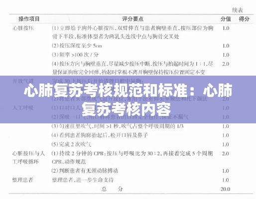心肺复苏(CPR)是一种急救技能,用于在心跳和呼吸停止时挽救生命。随着心肺复苏在公共安全和个人急救中的重要性日益凸显,对心肺复苏技能的考核规范和标准显得尤为重要。以下是对心肺复苏考核规范和标准的详细探讨。