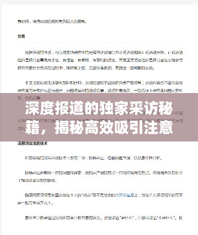 深度报道,作为一种重要的新闻形式,要求记者不仅具备扎实的专业知识,还需要掌握多种有效的采访方式,本文将探讨深度报道中常见的采访方式,帮助读者更好地理解如何进行深度报道。