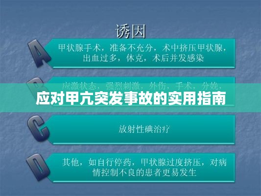 面对甲亢突发事故,首先要保持冷静,采取紧急处理措施,然后及时就医,在医生的指导下,调整药物剂量、调整饮食、规律作息等,以控制病情并预防甲亢突发事故的发生,保持良好的心态和乐观的心情对于治疗甲亢也至关重要,通过积极的治疗和调整生活方式,大多数甲亢患者都能有效控制病情并过上正常的生活。