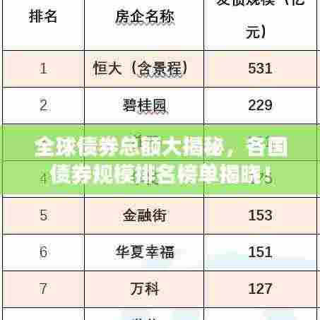 世界债券总额排名是衡量各国经济实力和金融市场发展状况的重要指标之一,美国、中国、日本、德国、英国等国家的债券市场在全球处于领先地位,了解世界债券总额排名对于投资者和政府都具有重要意义,随着全球经济一体化的深入发展,全球债券市场将呈现出更加开放、多元、互动的局面。