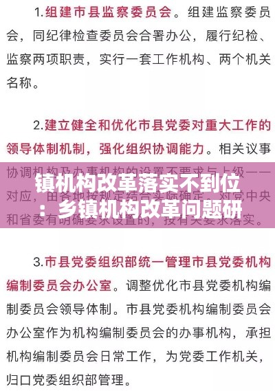 近年来,我国各地政府纷纷推进机构改革,旨在优化政府职能、提高行政效率、降低行政成本。然而,在改革过程中,一些地方的镇级机构改革落实不到位,导致改革效果不明显,甚至出现了反弹现象。本文将深入分析镇机构改革落实不到位的原因及其影响,并提出相应的对策建议。