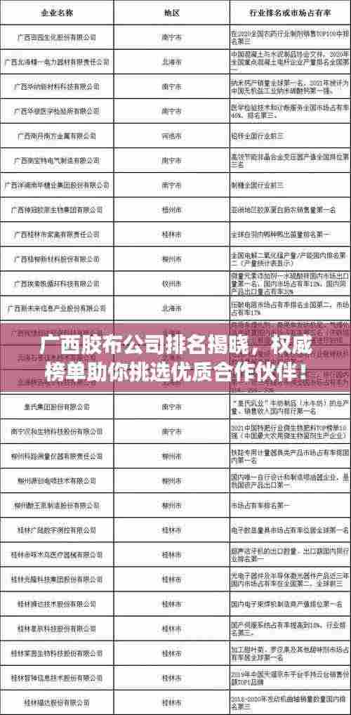 广西作为中国的重要省份,工业发展日新月异,其中胶布行业也取得了显著进步,本文将为您详细介绍广西胶布公司的排名,带您了解这些企业在胶布领域的实力与贡献。