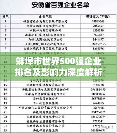 蚌埠市,安徽省的一个重要城市,近年来经济发展迅速,吸引了国内外的广泛关注,随着蚌埠市的经济崛起,其在全球范围内的排名也逐渐上升,本文将探讨蚌埠市的世界500强排名及其在全球经济中的影响力。