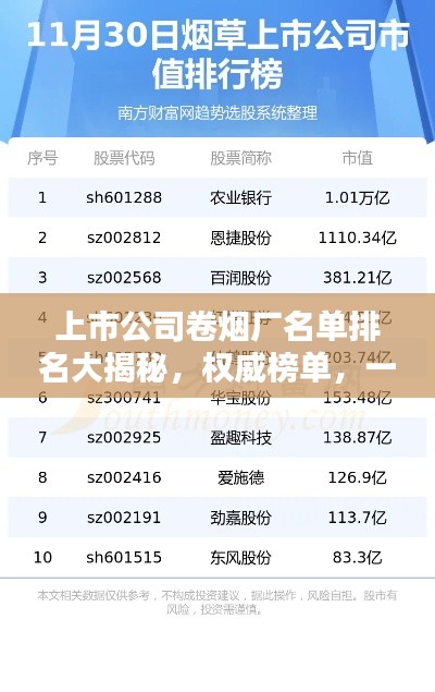 随着烟草行业的不断发展,越来越多的卷烟厂开始走向资本市场,成为上市公司,这些公司在市场竞争中表现出色,逐渐获得了消费者的认可和信任,本文将介绍上市公司卷烟厂名单排名,以便读者更好地了解这些企业的实力和规模。