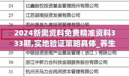 2024新奥资料免费精准资料333期不仅是一份普通的资料集,更是一个汇聚了大量经验和实践的知识宝库。无论是从事何种行业或领域的专业人士,都可以在这份资料中找到对自己有益的信息。我们建议用户充分利用这份资料,通过实地验证的信息来支持决策,结合养生理念来全面提升个人和团队的工作效率和生活质量。在信息化日益发展的今天,2024新奥资料免费精准资料333期无疑是通向成功的重要工具。