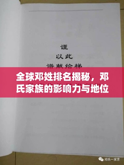 在全球各个角落,姓氏不仅代表着家族的传承,更是连接着历史与文化的重要纽带,邓姓,作为一个历史悠久的姓氏,在全球范围内都有着广泛的影响,本文将探讨邓姓在全球的排名,以及邓氏家族在世界各地的地位和影响。