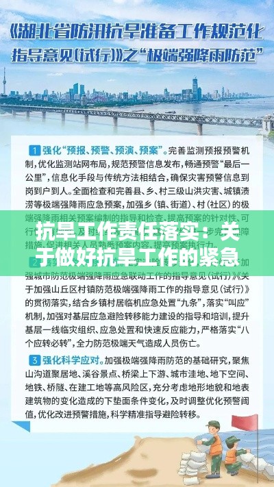 抗旱工作责任落实是保障农业生产和粮食安全的关键。通过明确责任主体、加强政策支持、优化水资源管理、调整农业结构、开展宣传教育与培训、建立监测预警与应急响应机制等措施,可以有效提高抗旱能力,减少干旱灾害损失。各级政府、相关部门和全社会都应积极参与抗旱工作,共同为保障国家粮食安全贡献力量。
