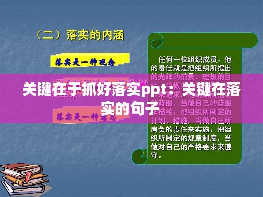 在当今社会,无论是企业的发展、政府的决策还是个人的成长,落实都是关键。只有将计划、目标和策略转化为实际行动,才能真正实现预期的效果。然而,落实并非易事,它需要我们不断努力、持续监督和精准执行。本文将围绕“关键在于抓好落实”这一主题,探讨如何确保落实的有效性,以及如何通过PPT展示这一理念。
