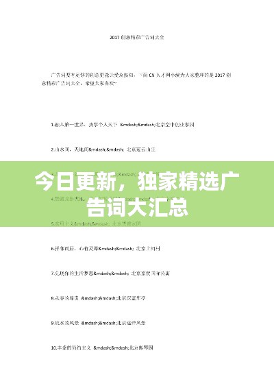 随着社会的快速发展和信息时代的到来,广告已经渗透到我们生活的方方面面,广告词语作为广告的核心组成部分,其创意和吸引力直接关系到广告的效果,本文为您带来今日最新的广告词语大全,助您一臂之力,让您的广告更具吸引力。