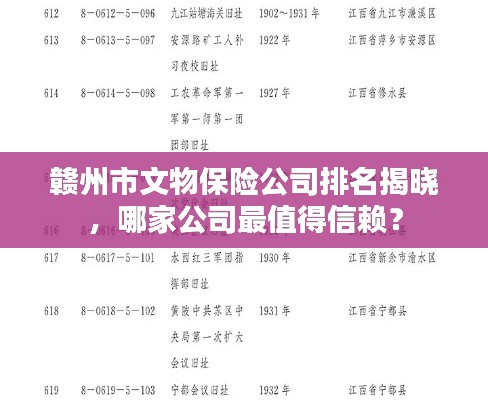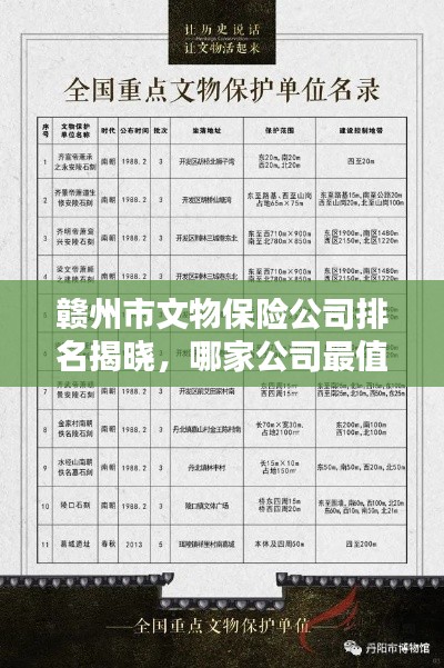 赣州市,坐落于江西省南部,拥有丰富的历史文化遗产和众多的文物,随着社会的快速发展,文物保护工作日益受到重视,文物保险行业也随之蓬勃发展,本文将探讨赣州市文物保险公司的排名,介绍几家在行业内表现突出的公司,为读者提供参考。