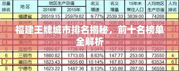 福建省,位于中国东南沿海地区,是一个经济发达、文化繁荣的省份,近年来,福建省内的各大城市发展迅猛,尤其是排名前十的城市,堪称福建的“王牌城市”,本文将为您详细介绍福建王牌城市排名前十名的情况。