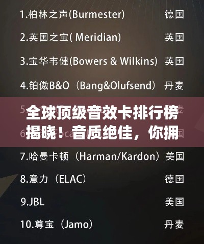 音效卡是现代生活中不可或缺的一部分,尤其在音乐制作、影视后期制作以及游戏开发中,它们扮演着至关重要的角色,哪些音效卡是全球最优秀的呢?我们将为您揭晓世界上最好的音效卡排名。