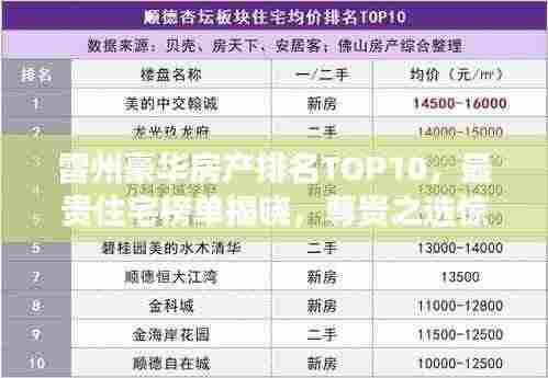 雷州作为广东省的一个重要城市,其经济发展迅速,房地产市场日益繁荣,随着城市化的推进和人们对高品质生活的追求,雷州的房产市场呈现出多样化的发展趋势,我们将为您揭晓雷州最贵房产排名前十名的豪华住宅,这些住宅代表了雷州房地产市场的顶尖水平和尊贵身份的象征。