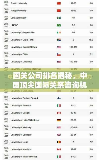 随着全球化进程的加速,国际关系的复杂性和敏感性日益提升,各国间的竞争与合作日趋激烈,在这样的背景下,中国的国际关系咨询行业逐渐崭露头角,众多优秀的国际关系咨询公司如雨后春笋般涌现,本文将围绕“国关公司排名”这一主题,揭示中国顶尖国际关系咨询机构的实力与影响力。