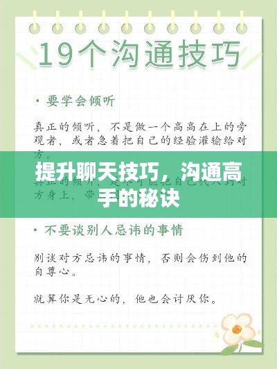 聊天是人际交往中不可或缺的一环,掌握好聊天技巧对于维护人际关系、传递信息以及解决矛盾等问题具有重要意义,本文将为你介绍如何不断提升聊天技巧,让你的沟通更加顺畅、有效。