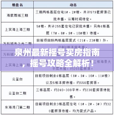 了解泉州最新摇号买房攻略对于购房者来说至关重要,购房者需关注政策动态、了解购房资格与条件、选择合适的楼盘与房源、掌握摇号流程与注意事项,并尝试提高摇号成功率,希望本文能为广大购房者提供有益的参考和帮助。