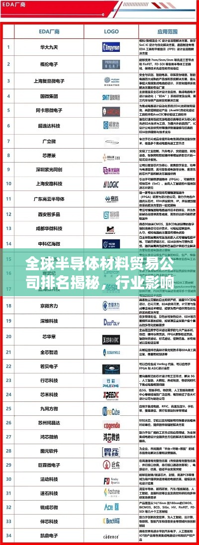 随着科技的飞速发展,半导体产业已成为全球经济增长的重要驱动力,半导体材料作为半导体产业的基础,其贸易公司的实力和影响力日益受到业界关注,本文将探讨全球范围内的半导体材料贸易公司排名及其行业影响力。