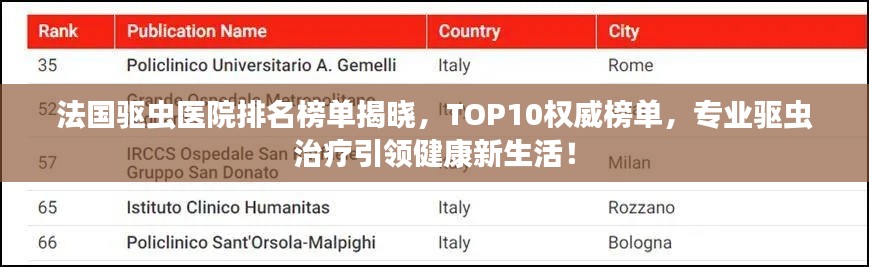 在法国内,对于寄生虫疾病的防治与驱虫治疗,各大医院均秉持专业与严谨的态度,本文将为您介绍法国驱虫医院排名前十名,这些医院在寄生虫疾病的诊断与治疗方面享有较高的声誉。