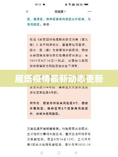 随着全球疫情形势的不断变化,我国各地疫情防控工作依然严峻,我们来关注陕西省西安市雁塔区的疫情最新报道。
