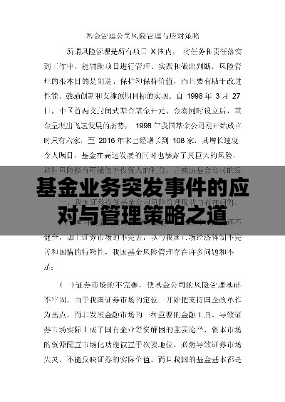 随着金融市场的日益繁荣,基金业务规模不断扩大,基金业务突发事件也呈现出频发趋势,这类事件不仅会对投资者造成重大损失,还可能影响整个金融市场的稳定,对基金业务突发事件的研究与应对显得尤为重要,本文将围绕基金业务突发事件展开讨论,分析事件类型、原因,并提出相应的管理策略。
