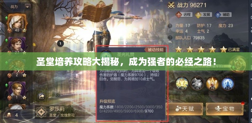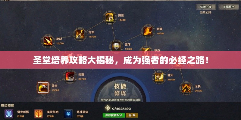 圣堂培养是游戏内提升角色能力的重要途径,通过圣堂培养,玩家可以提升角色的属性、技能、装备等方面,从而提高战斗力,在最新版游戏中,圣堂培养系统更加完善,为玩家提供更多成长机会。