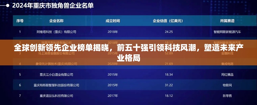 随着科技的飞速发展,创新已成为企业持续发展的核心动力,本文将为您揭晓世界前五十创新企业排名,这些企业在科技创新、产品研发、市场布局等方面均表现出色,引领着全球科技潮流,塑造着未来的商业格局。