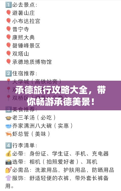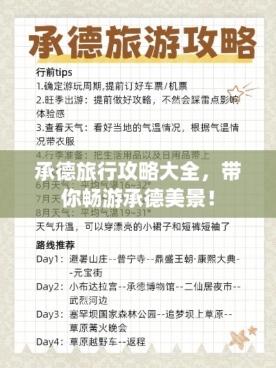 8、如果您计划进行户外探险或登山等活动,请提前做好准备并遵循专业人士的建议,在山区行走时,注意山路崎岖,穿着合适的鞋履以确保安全,了解当地的天气状况以及紧急救援措施也是非常重要的,在享受大自然美景的同时,务必确保自身安全,承德是一个充满魅力的旅游目的地,无论是历史文化还是自然风光都让人流连忘返,希望这篇最新的承德旅行攻略能帮助您更好地规划您的承德之行,祝您旅途愉快!