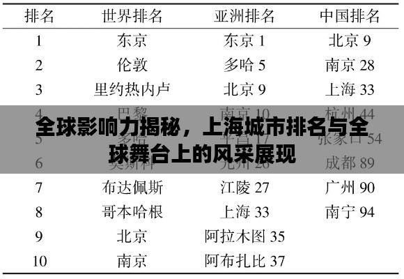 上海在全球城市排名中的位置及其在全球舞台上的影响力,都充分展示了其独特的魅力和实力,作为中国的代表城市,上海的发展不仅代表了其自身的崛起,也代表了中国的崛起。