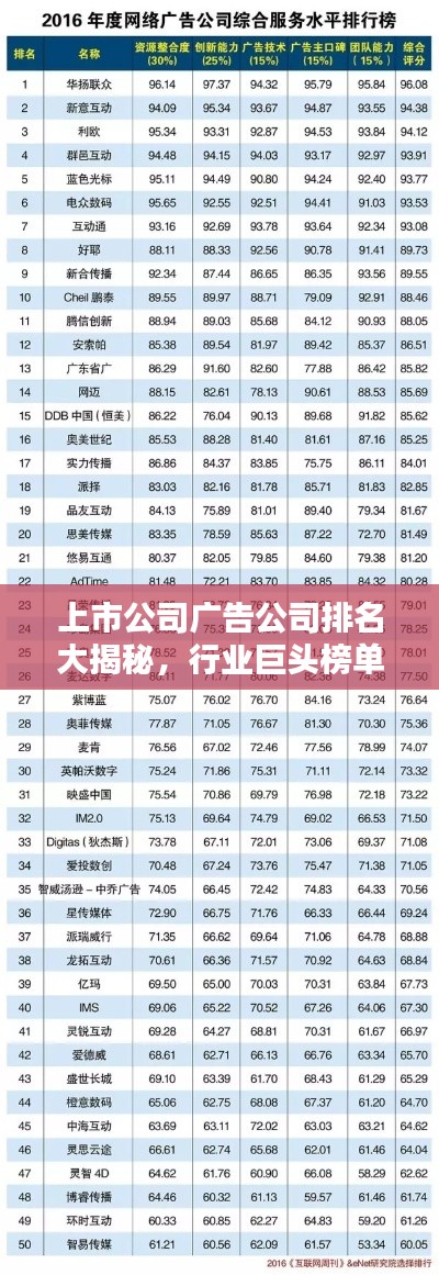 在当今社会,随着经济的飞速发展和市场竞争的加剧,广告行业也迎来了前所未有的发展机遇,上市公司作为行业的领军者,其表现尤为引人注目,本文将为您揭示上市公司广告公司排名,带您了解行业巨头。