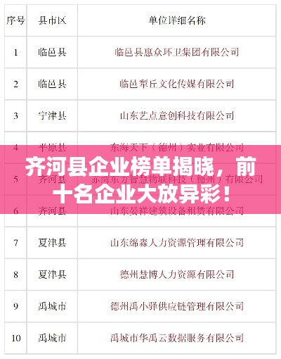 是齐河县企业排名前十名,这些企业在各自的领域内不断创新发展,为齐河县的经济发展做出了重要贡献,这些企业将继续发挥自身优势,加强技术创新和产品研发,为齐河县的经济社会发展做出更大的贡献。