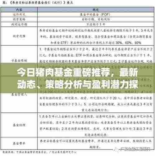 随着国内经济的稳步发展,猪肉行业作为重要的民生行业,一直受到广泛关注,猪肉基金的表现引人注目,本文将对今日猪肉基金推荐进行最新动态与策略分析,帮助投资者更好地把握市场机遇。