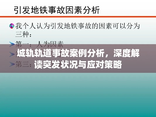 随着城市化进程的加速,城市轨道交通(城轨)在各大城市中的地位日益重要,在城轨运营过程中,偶尔会发生一些突发事故,这些事故不仅影响城市轨道交通的正常运营,还可能对乘客的生命财产安全构成威胁,本文将对城轨轨道突发事故案例进行分析,以期提高公众对城轨安全的认识,同时为城轨运营管理部门提供借鉴和参考。