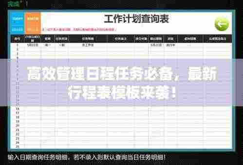 今日行程表模板最新是帮助人们高效管理时间与任务的利器,通过合理使用行程表模板,我们可以更好地安排自己的时间,提高工作效率,平衡工作与生活,在选择行程表模板时,要注意选择界面简洁明了、自定义性强、任务分类清晰、提醒功能完善以及具备数据分析与统计功能的模板,在使用过程中,要合理使用、及时调整并持之以恒,养成良好的时间管理习惯。