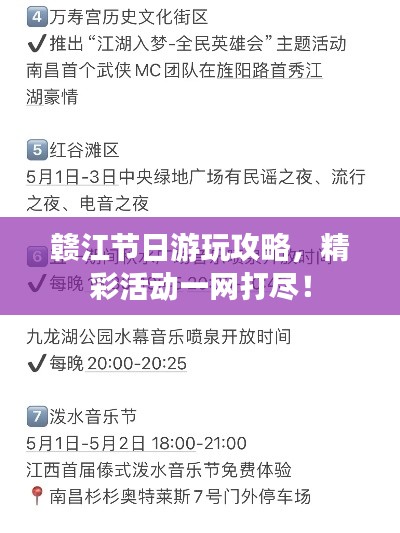 赣江节日旅游是一次难忘的体验,游客可以在欣赏美景的同时,感受浓厚的节日氛围和深厚的文化底蕴,在规划行程时,建议提前了解当地情况,合理安排时间,确保旅途愉快,希望这份攻略能帮助您更好地规划赣江节日旅游行程,祝您旅途愉快!
