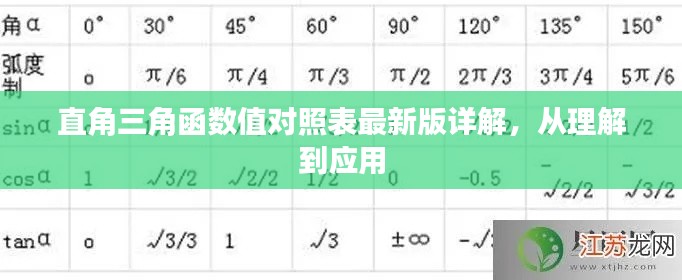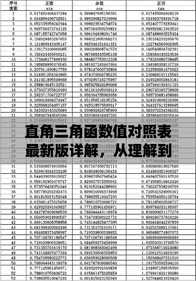 在三角学领域,直角三角函数值对照表是学习和应用三角函数的重要工具,随着数学理论的不断发展,最新的直角三角函数值对照表包含了更精确的数据和更广泛的应用场景,本文将介绍直角三角函数值对照表最新版的相关知识,包括其重要性、使用方法以及在实际中的应用。