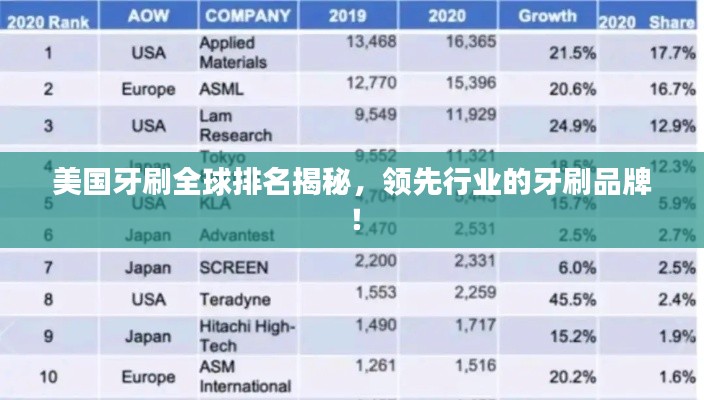 美国的牙刷产业在全球市场中具有重要地位,排名前列,其成功的原因在于技术创新、品牌影响力、品质保证和市场需求等多方面因素,美国的牙刷产业需要持续创新,提高产品品质,关注新兴市场的发展,以应对全球市场的挑战,保持其领先地位。