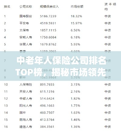 随着人口老龄化趋势的加剧,中老年人保险市场逐渐受到关注,对于中老年人来说,选择一家合适的保险公司至关重要,本文将介绍当前市场上在中老年人保险领域的领先公司,为读者提供一份中老年人保险公司排名。