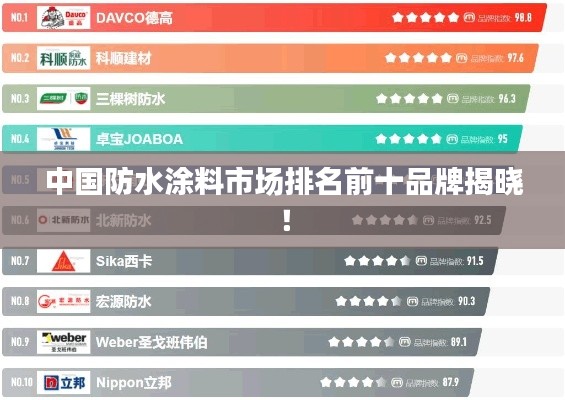 中国防水涂料市场经过多年的发展,已形成了一批具有影响力的品牌,这些品牌不仅在产品质量、技术创新方面表现出色,还在服务、市场份额等方面拥有显著优势,随着建筑行业的快速发展,防水涂料市场需求持续增长,市场竞争也日趋激烈。