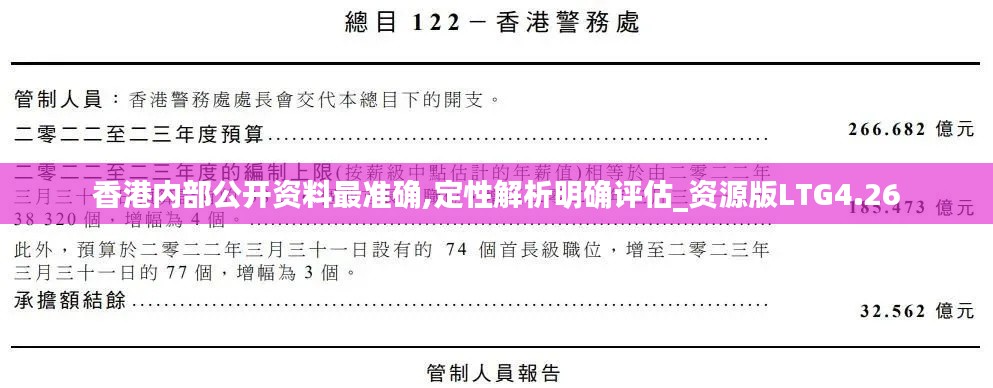 在当今信息爆炸的时代,数据的准确性和可靠性变得愈发重要。特别是在香港这个国际金融中心,内部公开资料的准确性对于各类决策有着举足轻重的作用。本文将围绕“香港内部公开资料最准确,定性解析明确评估_资源版LTG4.26”这一主题,深入探讨香港内部公开资料的价值、准确性及其在各个领域的应用。