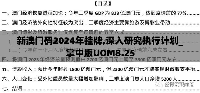 新澳门码2024年挂牌是澳门经济发展的重要举措。通过深入研究执行计划,我们可以看到新编码体系为澳门带来的巨大机遇。面对挑战,澳门政府和企业应共同努力,推动新澳门码的顺利实施,为澳门的繁荣发展注入新的活力。