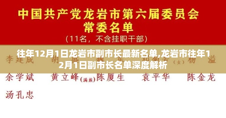 摘要:,,根据最新消息,以下是往年12月1日龙岩市副市长名单的深度解析。这份名单反映了龙岩市政治生态的变迁和领导层的人事变动。通过对这份名单的研究,可以了解到龙岩市政治格局的发展变化以及不同副市长的职责和贡献。这些副市长在各自的领域都有卓越的表现和贡献,共同为龙岩市的发展做出了积极的努力。
