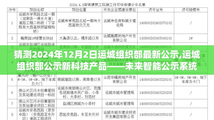 摘要:,,据最新猜测,运城组织部将于2024年12月2日公示一项新科技产品——未来智能公示系统。这一系统的推出将给公众带来极大的便利和震撼。该系统具备智能化、高效化特点,能够实时更新公示信息,提高透明度,促进公平公正的公开环境。未来智能公示系统的登场将引领运城组织部科技创新的新篇章。